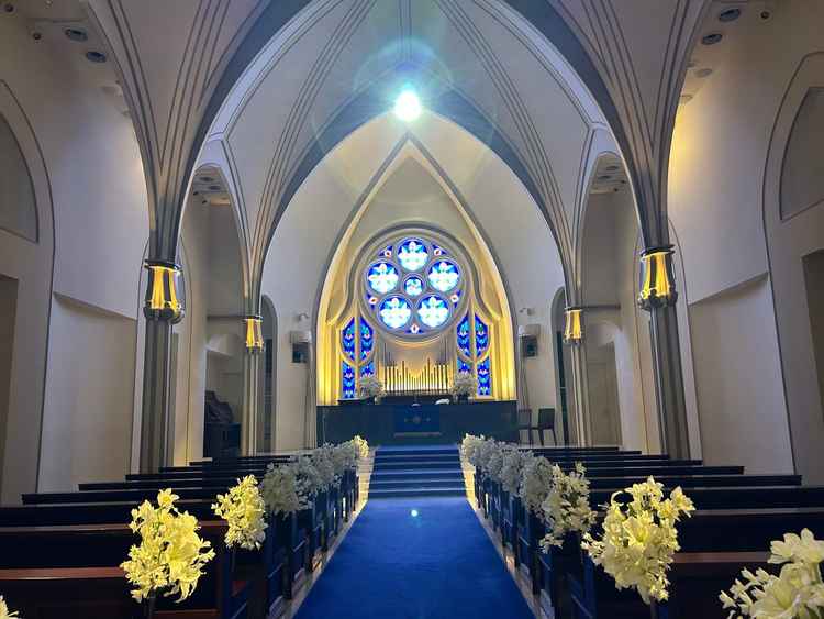 ウェディングドレスが映える ロイヤルブルーのチャペル