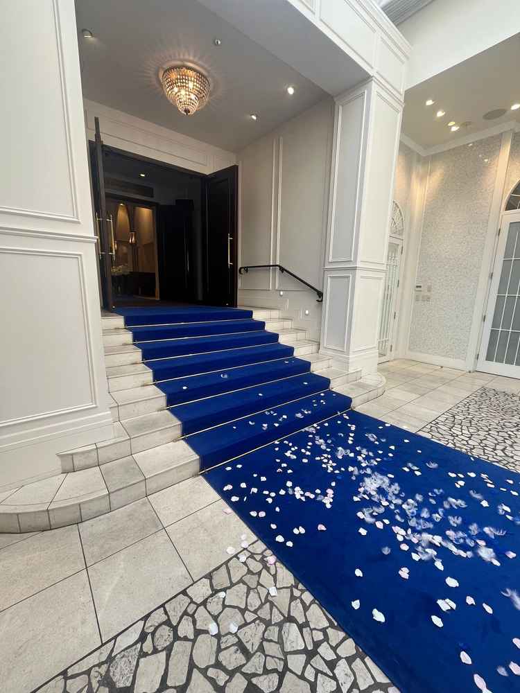 青いバージンロードが印象的な式場 | アニヴェルセル 白壁
