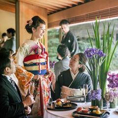 【唯一無二の石舞台挙式】日本庭園の中央に位置する石舞台での屋外挙式は河文ならでは。お琴の生演奏や水合わせの儀など伝統的な演出もおすすめ。フェアでは先輩カップルの写真を交えてご説明いたします。