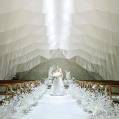 【唯一無二の『デザイナーズチャペル』で入場体験】◆幾重にも重なる白いヴェールと光が幻想的◆「初めて見るデザイン!」とゲストにも好評◆フェアでは、オリジナル演出の体験も◆大階段でのフラワーシャワーも叶う