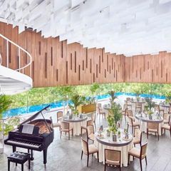 【爽やかなウォーターテラスに囲まれた会場を見学】◆窓をフルオープンにすれば、風も感じる開放的なパーティに◆テラス入場・階段入場などの演出を体験◆120名OK!ゆとりある広さもチェック