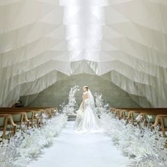 【唯一無二のデザイナーズチャペルを体験】◆天高8m!幾重にも白いヴェールが重なる◆「この雰囲気は初めて」と見学カップルから大人気!◆大切な人との絆が深まる挙式を体感◆大階段でのフラワーシャワーも◎