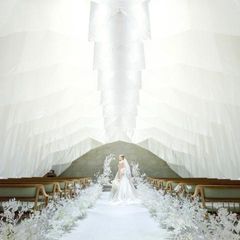 【唯一無二の『デザイナーズチャペル』で入場体験】◆幾重にも重なる白いヴェールと光が幻想的◆「初めて見るデザイン!」とゲストにも好評◆フェアでは、オリジナル演出の体験も◆大階段でのフラワーシャワーも叶う