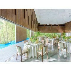 【爽やかなウォーターテラスに囲まれた会場を見学】◆窓をフルオープンにすれば、風も感じる開放的なパーティに◆テラス入場・階段入場などの演出を体験◆120名OK!ゆとりある広さもチェック