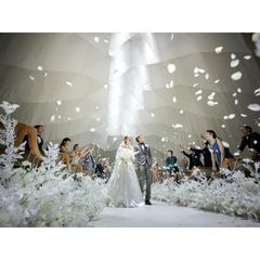 【唯一無二の『デザイナーズチャペル』で入場体験】◆幾重にも重なる白いヴェールと光が幻想的◆「初めて見るデザイン!」とゲストにも好評◆フェアでは、オリジナル演出の体験も◆大階段でのフラワーシャワーも叶う