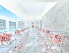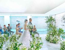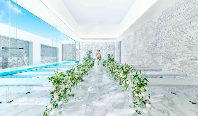 光・水に包まれるリゾート邸宅を体験爽やかな風・涼やかな水音・陽光が照らす木々の緑-一歩足を踏み入れると、非日常の特別感を感じる「ブラン:ベージュ」。なかでも人気なのは、輝く水面に囲まれたガラスのチャペル。大理石のバージンロードに射し込む水面に反射した自然光など明るく清々しい雰囲気を感じて ポイントきらきら輝く水面に囲まれたチャペルは必見!