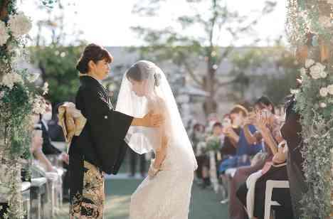 新郎さまのたっての希望で、お互いの姿は挙式で初めて見ることにしたおふたり。新郎・新婦それぞれがご家族とのファーストミートを行いました。挙式は爽やかな秋の青空の元、ガーデンで。ガーデンにお母さまと入場・ヴェールダウンを行う姿にしょうたさんは涙。たくさんのゲストに見守られる中、感動の入場シーンとなりました。