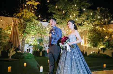 後半はブルーのカラードレスに身を纏い、キャンドルコーディネートされたガーデンからの入場です。後半もお友達からの余興やビュッフェタイムなどを楽しみ、パーティはクライマックスへ。ふたりのこだわりの手作りムービー。ゲスト誰もが「参列してよかった」と思ってほしい、そんな想いが籠った映像にゲストは目を潤ませながら、ふたりと積み重ねた時間に思いを馳せながら―。パ―ティは感動のフィナーレに向かいました。