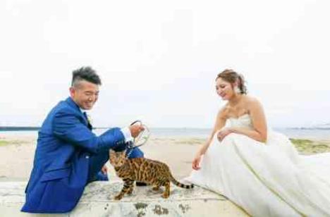 おふたりの愛猫ちゃんと海でロケーションフォトを行いました♪猫ちゃんもしっかりカメラ目線で可愛いショットが撮影出来ました!海でのロケーションフォトはとても人気で、今回はナイト撮影も行い、幻想的なシーンも撮影出来ました! 結婚式当日のウェルカムスペースにも猫ちゃんをあしらった小物や写真も飾りおふたりらしいオリジナルなウェルカムスペースに仕上げました。