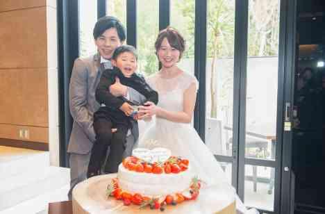 いちごがたっぷりのった可愛いウエディングケーキ!上には大きなハートのチョコプレートをあしらいました♥入刀後はお子様へケーキバイトを行いましたが、照れてしまい食べられなかったのですが最後の写真ではとびきりの笑顔を見せてくれました!ウエディングケーキはデザートでゲストの皆さまへ幸せのおすそ分けとして美味しく召し上がりました♥