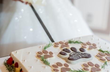 おふたりの特別な1日を彩るウエディングケーキ。ケーキ入刀のあとは、ファーストバイトを行いました! 段数・形・色など、全てをおふたりで考えていただいた、オリジナルのケーキを作成することができます!おふたりのお名前だけでなく、おふたりのわんちゃんのお名前も入っていて、とっても可愛く、おふたりのわんちゃんも主役になるウエディングケーキの完成です♡