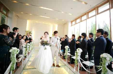 ガラス張りの開放感溢れるチャペルで大人数でも圧迫感を感じさせず、お二人の大好きな人たちに囲まれながら挙式が行われました。ゲストからの祝福を受け終始、笑顔が絶えず幸せそうなお二人♪新郎新婦様ともに、晴れ姿がお似合いでスタッフも思わず見とれてしまいました♥