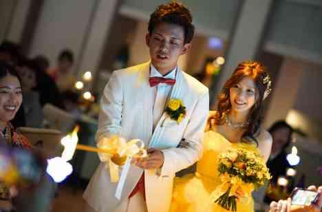 お色直し入場ではキャンドルサービスが行われました。各テーブルに置いてあるキャンドルにお二人が火を灯していきます。キャンドルは更に七色に光り出しゲストもびっくり!披露宴会場は幻想的な雰囲気に包まれていきます♥