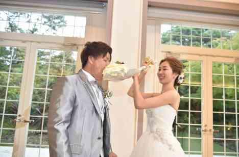 披露宴もお友達やご親族様とおふたりの大切な人々に囲まれて終始、とても盛り上がる楽しい結婚式でした♪その中でもひときわ盛り上がったのは新郎新婦様の「ファーストバイト」。新婦様が大きなスプーンで新郎様へ愛情の分だけケーキを取ります。新婦様の愛情に応えようと大きな口を開ける新郎様。おふたりの仲の良さが伝わるシーンでした♪