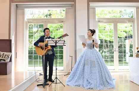 披露宴の終盤で、なんとおふたりから ゲストの皆様へサプライズの歌のプレゼント♪ 新郎様のギター演奏とおふたりの歌声が 会場内に響き渡りとても素敵な演出となりました! この日までにおふたりもたくさん練習をしてきたそうです ゲストの皆様もびっくりされた様子で とても喜ばれていました♪ ゲスト様へ感謝の気持ちを伝られるとても素敵な演出でした♪