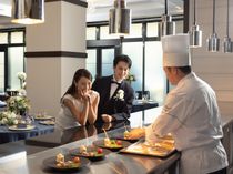 【ライブキッチン】でより一層華やかに♪ベルヴィ専属シェフとキッチンスタッフで おふたりの大切なゲストをおもてなし 披露宴会場【ミュゼ】ではライブキッチンで 食材や料理の香りを楽しみ 視覚でも味覚でも味わうことが出来ます