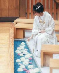- 祭壇へと続く太鼓橋脇の水盤には清らかな水が湛えられ、花を浮かべる事もOKなので、神殿をお二人らしい空間に彩る事も♪オススメ演出は「手水の儀×花手水」ゲストが神殿に入る際にも、水×花を使った空間作りでこだわってみても素敵。プランナーにぜひ相談してみて