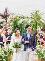 芝生の敷かれたグラスガーデンでは自然光が降り注ぐ中でゲストからの素敵なフラワーシャワーを。青い空、白亜の建物、緑が眩しい芝生。この3色でお二人も、ゲストもリゾートを感じていただけるでしょう。開放感溢れる大空の下で素敵な思い出を!