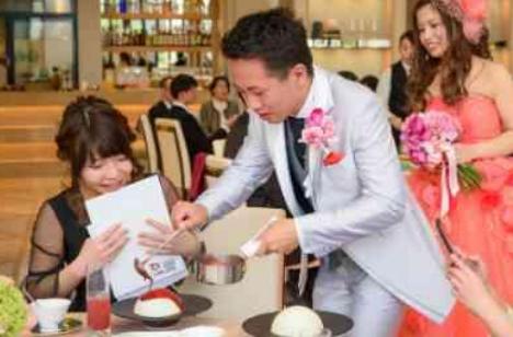 パーティーではゲスト参加型のゲームを行いたいとご希望がありました。 そこで、ロビーにはお二人とご家族様などの幼少期のお写真を並べ、ご新郎ご新婦それぞれのお写真はどれか…ゲスト全員参加型の投票ゲームを行いました。 当たりの方にはプレゼントだけでなく、デザートの仕上げをお二人より完成させて頂くサプライズで盛り上がりました。