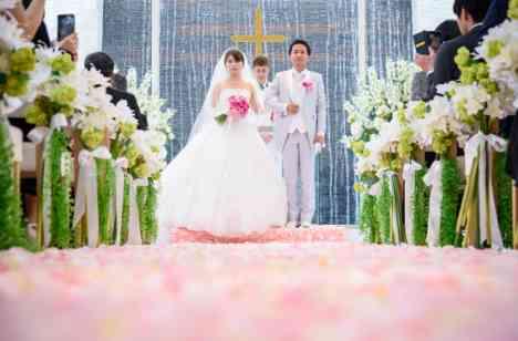 ご新郎様は緊張しすぎてロボット歩きになってしまい、皆様はたちまち笑顔になりました。 ご新婦様入場の際はゲストから「わ~!!」と歓声が上がり、対象的な入場シーンとなりました。 その後のフラワーシャワーでの祝福で、やっと緊張が取れ本来の笑顔のご新郎様でした。
