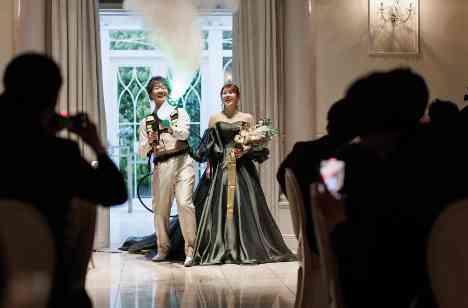 再入場のシーンも一味違うおふたり。新婦が大好きな曲でしっとりとご入場。新郎はジェットガンを背負って盛大に入場したい!と意見が分かれ曲を変えるか悩みました。おふたりそれぞれの希望を叶えるために、新婦はしっとりと曲頭から登場、新郎はサビ近くで盛大にジェットガンを噴出して登場!まさかの演出にゲストはびっくり!その後のドレスの色当てクイズも大盛り上がり!記憶にも記録にも残りました。