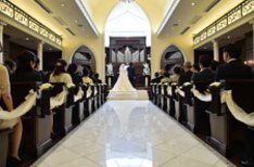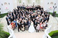 ヨーロッパを思わせる白亜のチャペル。たくさんのゲストのみなさまに見守られる中、ご新婦様は大理石のバージンロードを歩き、ご新郎様のもとへ。 感動の挙式の後は、笑顔でチャペルの外に出るおふたり。ゲストから祝福のフラワーシャワーを受けて、一層喜ばれているようでした。 おふたりの幸せの瞬間をとらえようと、ゲストの方もたくさん撮影されていました。