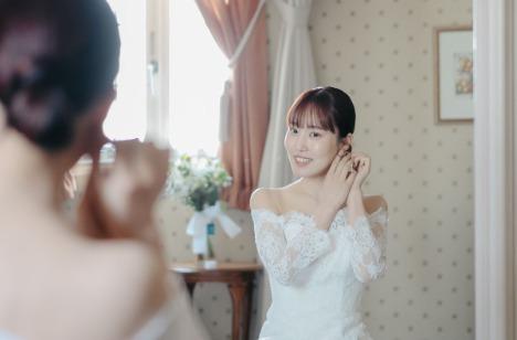 挙式中は、陽光が溢れ、緑も感じられるナチュラルな雰囲気の中、温かみを感じるお写真を撮影されました。 入場前の親御様への感謝の想いを伝える動画演出では、ご両親とも涙を流され、その姿を見たおふたりも感極まっていたご様子。ご新婦は、御父様は絶対に泣かないだろうと思っていたため、ここまで育ててくれたことに、改めて感謝の気持ちが込み上げ、式を挙げたことが1つの親孝行になったと実感し、嬉しく思ったそうです。