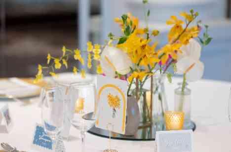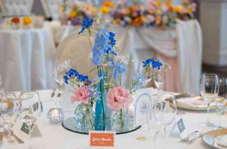 挙式では、大切なゲストに誓いをたてる人前式を。挙式は愛犬がリングドッグとして登場したり、新郎の入場ではじゃけとセレモニーを行い様々な想いが込み上げてきました。 披露宴ではゲストテーブルを1テーブルずつお花をテーマに異なるコーディネートにミモザやチューリップなど テーブルにはお花の名前の手作りのテーブルナンバーを置いて素敵なコーディネートを叶えました。一足早い春を感じる結婚式に