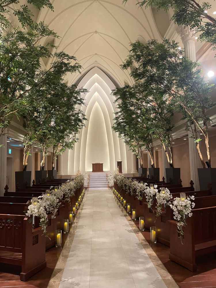 挙式の白と緑のコントラストが可愛く、アットホームな披露宴会場