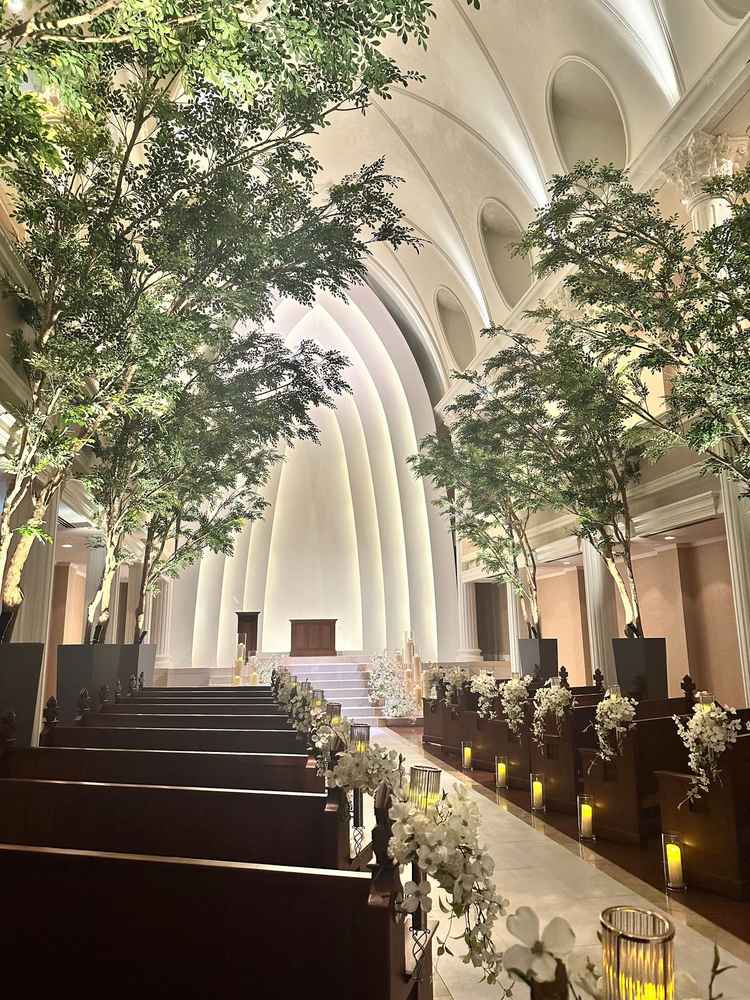 挙式の白と緑のコントラストが可愛く、アットホームな披露宴会場