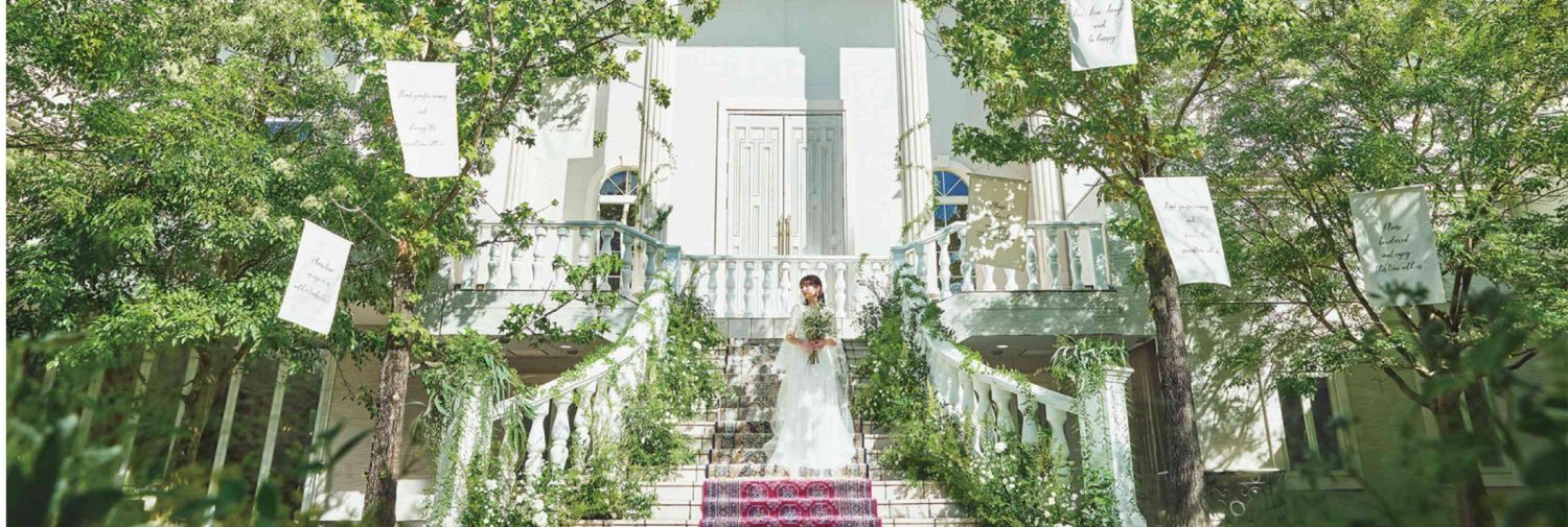 広々としたガーデンに佇む白亜の大邸宅は、まるでヨーロッパのお屋敷のよう。閑静な住宅街に佇む非日常空間で、一生思い出に残る一日を過ごして。ガーデンでの演出は、まるで外国映画のワンシーンのよう。
