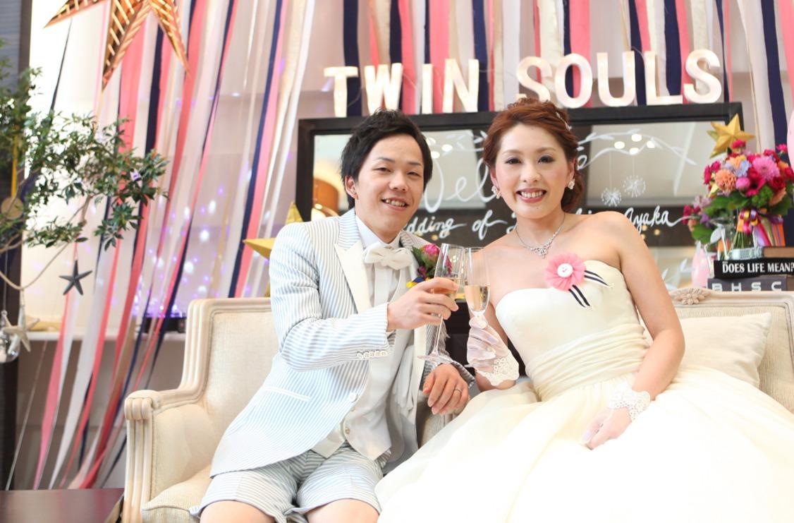 もともと価値観も性格も違う者同士惹かれあったふたり。でも今までに出逢ったどんな出逢いよりも お互いの出逢いを大切に感じているふたり。共通する二人の想いはご両親やゲストへのたくさんの「アリガトウ」を伝えたいということ。今までにないくらい「ふたりらしい式だった」と感じてほしい。何もかもが違うふたりだからこそ「ふたりでひとつ」。そこから「Twin Souls ~きみはぼく~」というコンセプトが決定。