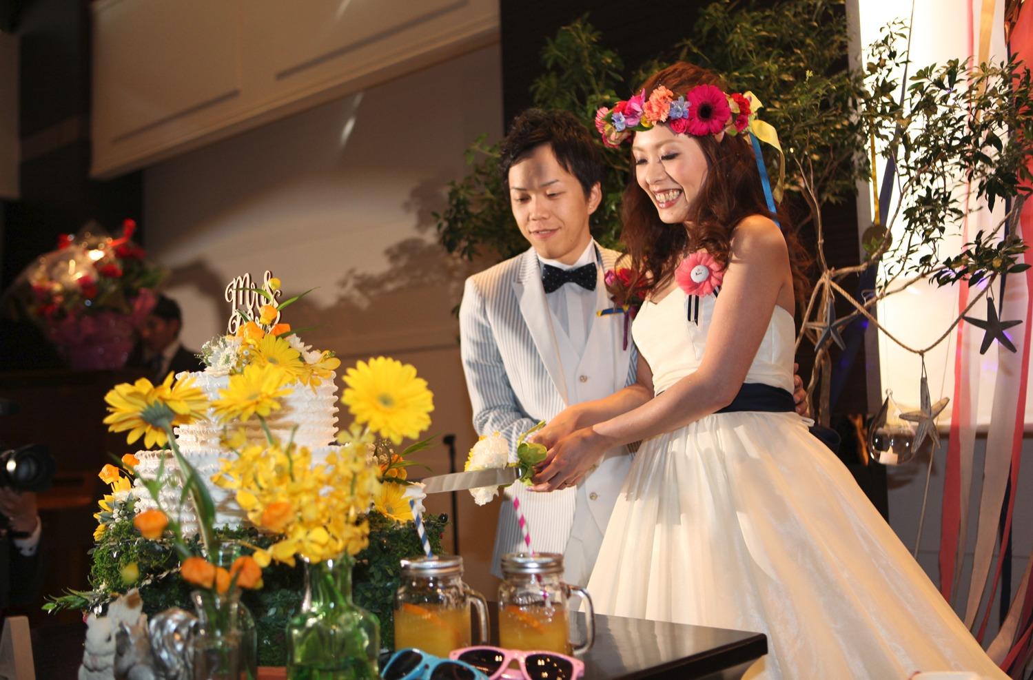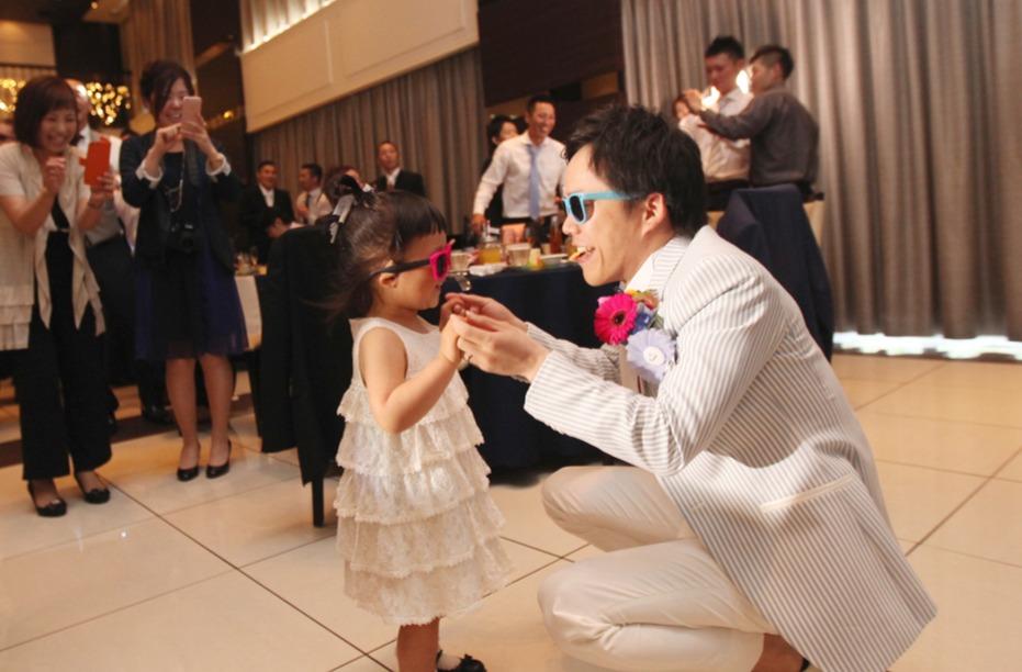 厳かな和装人前式とは打って変わって、華やかなパーティースタイルで。ドレスコードはサングラス。ゲストの皆様もリラックス。笑いあり、涙ありのとても賑やかなパーティーとなりました。
