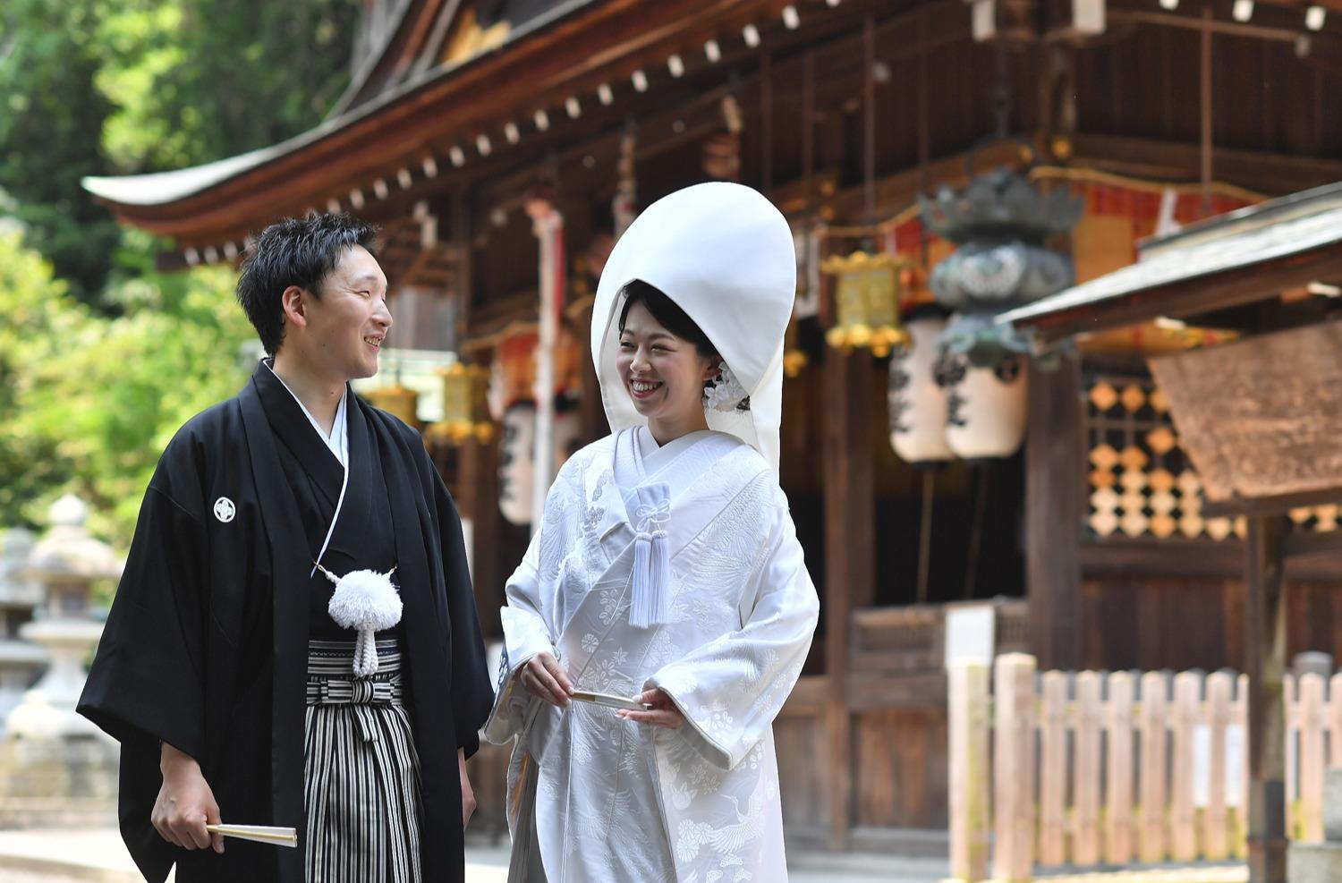 結婚式は式場からほどなくの距離にある日群八幡宮にて。紋付袴、白無垢姿で新しいスタートの誓いを。