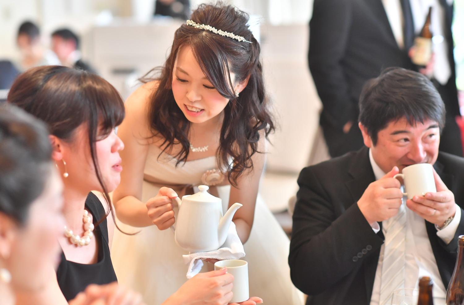 おふたりのウェディングロゴとなったモチーフがあしらわれたとてもかわいいマグカップがお一人お一人のお席に。おふたりおすすめのスイーツと共に、おふたりが感謝の気持ちを込めてコーヒーを注いで回られました。ゲスト一人一人との会話も楽しめ、素敵な笑顔で会場が包まれていました。