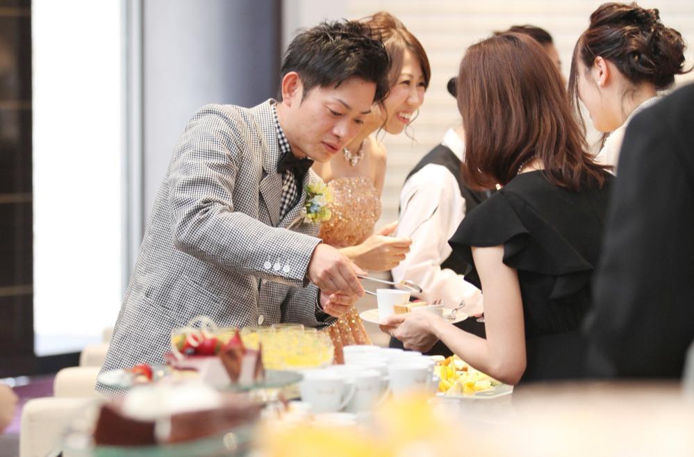 少しでもたくさんのゲストと直接お話をして、感謝の気持ちを伝えたい。そんな思いで様々なゲスト参加型の演出をご準備。その中でも皆さんが笑顔になれる時間がデザートタイム。ロビーにビュッフェを用意して、おふたりが直接ゲストへサーブするお時間を取りました。