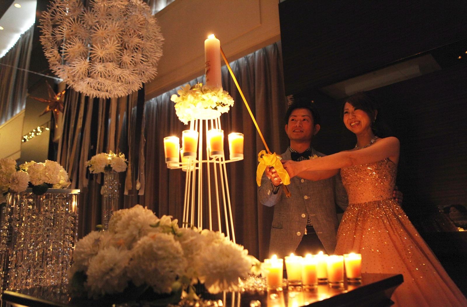 ふたりのメインキャンドルの周りは、ゲストのお二人への願いが込められ一つずつリレーされてきたキャンドルでいっぱい。ゲストの想いとふたりの想いで点灯されたメインキャンドル。さらにメインステージはきらきらと輝いていました。