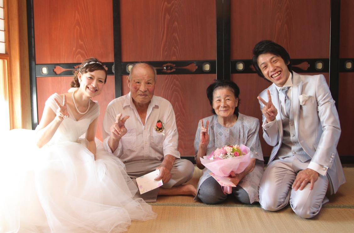 これから人生を共にするお二人やそのお二人を取り囲むゲストが幸せの波で包まれるよう… アットホームな結婚式をご提案させて頂きました。家族の絆を大切にしたいお二人。 会場にいるご家族だけではなく、出席できない大好きなおじいちゃん、おばあちゃんにも晴れ姿を見てほしいと思われ、ご自宅でのお仕度をご提案。 お手紙をお渡しや写真撮影も出来て、おふたりにとっては素敵な1日のスタートになりまし
