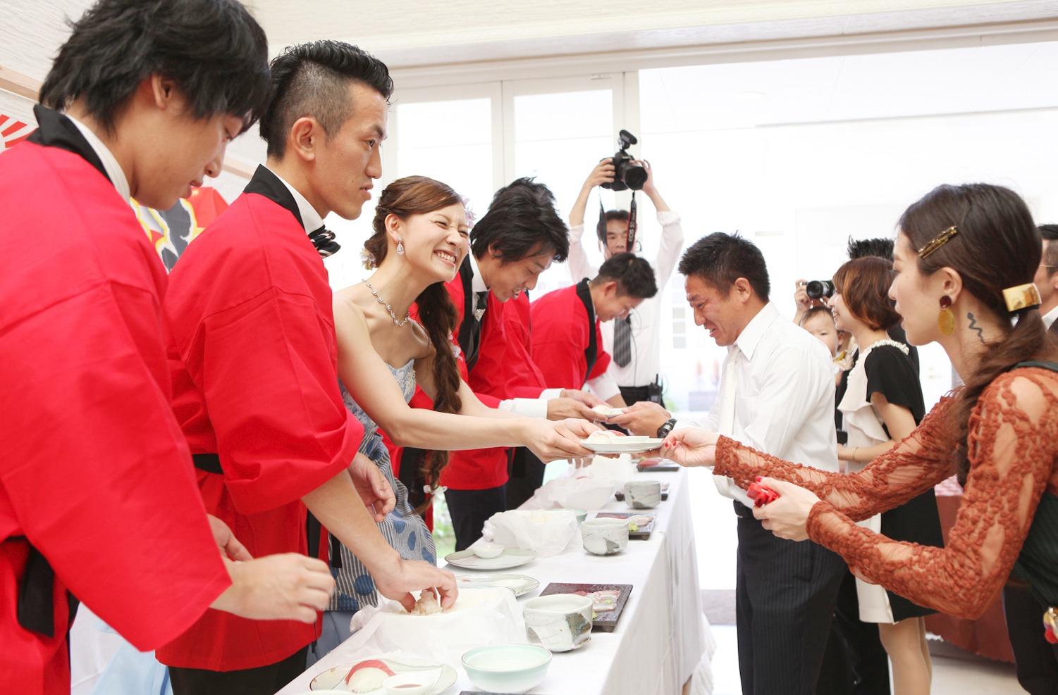 おふたりが出会ったきっかけと場所は寿司屋のアルバイト。にぎり職人も参加のスペシャルウェディングでゲストの皆様にお寿司をふるまいました。