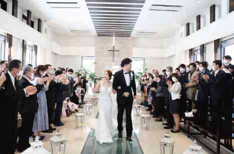 お母様からのベールダウンに、お父様のエスコート。それを笑顔で迎える新郎様。緊張感漂うに結婚式も、和やかでとても温かい雰囲気の中進んでいきました。ゲストが対面式に着席頂くスタイルは、おふたりにとっても安心感があり、ゲストの皆様に見守られるような感覚で結婚式が進みます。すべての進行が滞りなく進み退場の際には、おふたりもゲストの皆様もとても晴れやかな笑顔♪