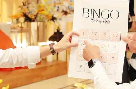 おふたりからの余興としてエピソードビンゴ大会を企画されました。各テーブルごとにエピソードにまつわる回答を相談して頂いたりすることは、テーブルの中での会話も弾み、さらに答えの発表のたびに会場全体が盛り上がります。おふたりとゲストの皆様が一緒にコミュニケーションを楽しむことが出来、また会場にいるゲストの皆様が一斉に参加できる演出やご余興は、とても印象に残るものになると思います。