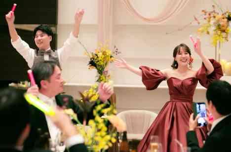 お色直しの入場は、カラードレスの色当てクイズの正解発表に。それぞれが投票されたカラーと同じ色のペンライトをお持ちいただきました。新郎新婦様は正解のカラーのペンライトをもって登場。おふたりが自らダンスをしながらご登場。スタッフも一緒に参加をさせて頂きました!音楽に合わせてカラフルなペンライトが揺れる様子は、おふたりがご希望されたようにまるでライブ会場にいるような雰囲気に♪会場が一つになった演出です。