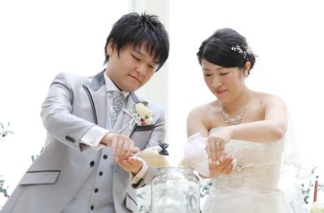 新潟県出身の新郎様と滋賀県出身の新婦様。別々の土地で育ったおふたりが一つの家族になることを演出で表しました。新潟県産、滋賀県産のお米をそれぞれお持ち頂いて、おふたりで合わせて頂きました。ゲストからも大きな拍手が沸き起こります。
