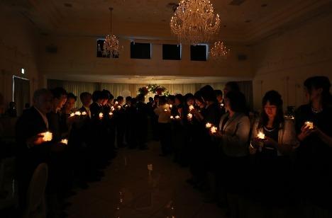 おふたりのお色直しご入場の際、ゲストの皆様で登場口からメイン席までの間に、花道を作って並んで頂きました。そしてゲストのそれぞれにはキャンドルが。ご両親からスタートしたキャンドルリレーでメイン席まで続くキャンドルの道。その中をご入場されたおふたりが進まれ、最後は全員で願いを込めてブローアウト。
