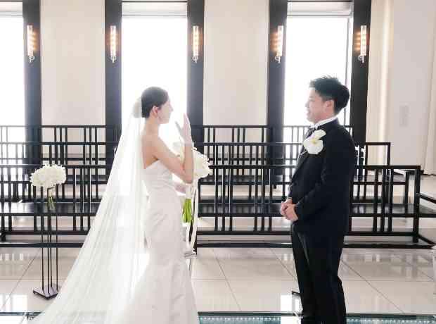 おふたりが選ばれた挙式スタイルは人前式。おふたりの結婚の誓いは、おふたりが大切に思っておられるゲストの皆様に聞いてほしい。承認をしてほしい。おふたりのお好みに装飾されたシンプルでスタイリッシュなチャペルの中で、温かいゲストの笑顔に見守られて進んで行く結婚式は、緊張感の中にも、とても温かい雰囲気に包まれた温もり溢れる時間になりました。