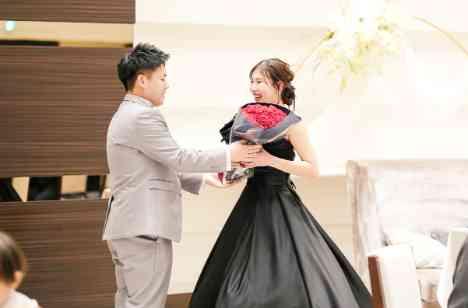 プロポーズは新郎様のお誕生日に108本の赤いバラの花束をプレゼント。新婦様からのOKのお返事は新郎様にとっては素敵なバースデープレゼント。そんな素敵なエピソードをお持ちのおふたり。披露宴当日には、そんな素敵なプロポーズを再現したような、新郎様から新婦様への赤いバラの花束のプレゼントをご用意されました。
