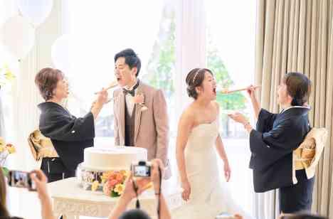 おふたりの結婚は、お母様にとっても忘れることのない大切な出来事。ケーキセレモニーでは、感謝の思いと、子育てからの卒業という意味も込めてお母様にラストバイトをお願いしました。おふたりとお母様との演出は、ご友人の皆様はもちろんですが、おふたりを幼い頃からご覧になられていたご親族様にとっても、心温まる演出で感動がうまれるきっかけになると思います。