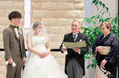 人前式での誓いの言葉。今回はそれぞれの親御様からの「問いかけ」に対して誓われるというスタイルを取られました。その問いかけも少しユニークに。お互いの出身地である「関西弁」と「熊本弁」で問いかけて頂きました。緊張感ある結婚式が温かく、自然とそこにいる皆様の笑顔を引き出すことが出来る、素敵な演出になりました。