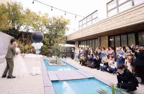 挙式後のアフターセレモニーはガーデンテラスで。おふたりがこれから迎えられる新しい命の性別発表を。ゲストの皆様が温かく見守られる中、バルーンをスパーク。ピンクのバルーンが出てきたら女の子、ブルーのバルーンが出てきたら男の子です。これからおじいちゃん、おばあちゃんになられる親御様にとっても、ワクワクする素敵なサプライズ演出です♪おふたりの大切なお子様の誕生を、皆様が心待ちにされています。