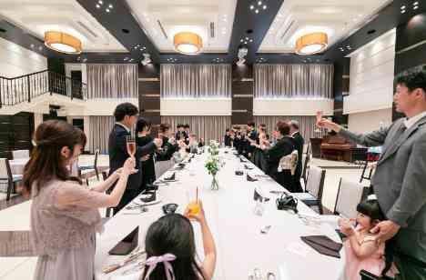 今までのこの先もずっとご縁が続くご親族様。そんな方々と会話やお食事を楽しむ為、高砂席は設けず同じテーブルを囲むことにされました。普段からお付き合いがある方達だからこそのエピソードが飛び出したり、自然と笑顔や会話が溢れる温かい時間となりました。キッズゲストも多く、退屈しないように、楽しめる工夫も。キッズゲストがたくさんの大人ゲストと交流が出来るようにとじゃんけんビンゴを企画されました。